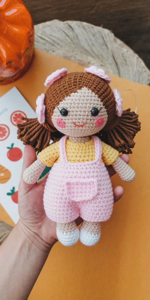 Meet your new favorite handmade friend — a sweet crochet doll dressed in soft pink overalls and a sunny yellow shirt! With her rosy cheeks, brown pigtails, and delicate flower hair accessories, this amigurumi doll is a charming project for crafters who love detail and personality. Perfect for gifting or collecting, she’s a true labor of love that will make anyone smile.